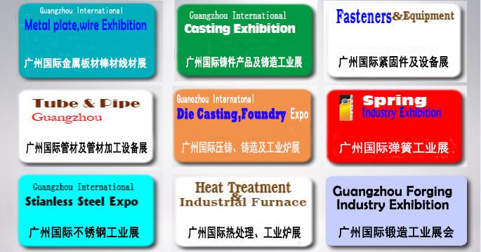廣州國際壓鑄、鑄造及工業爐展覽會DIE-casting Exhibition 廣州國際熱處理、工業爐展覽會廣州國際熱處理、工業爐展覽會 廣州國際鑄件展覽會 廣州國際鑄件展覽會 廣州國際管材展覽會TUBE & PIPE PROCESSING EQUIPMENT EXHIBITION 廣州國際緊固件及設備展覽會 Faster Exhibition 廣州國際不銹鋼工業展STAINLESS STEEL INDUSTRY EXHIBITION 金屬板材、棒材、線材及金屬加工、配套設備展覽會 PLATEMETAL Exhibition 廣州國際彈簧工業展覽會Spring Exhibition 鍛造展forging Exhibition